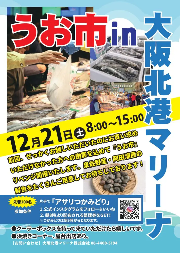 大阪府下で一、二を争う漁獲量を誇る泉州の魚処「泉佐野漁港」の漁師さんが漁に出て大阪北港マリーナに朝どれ鮮魚をお届け! 会場で、とれたての新鮮な魚を安価で購入できるほか、魚は漁師さんが無料で捌いてくれるので安心! さらに、公園内ではあら汁・海鮮丼・サザエ壺焼き・焼き牡蠣などの販売や魚すくいも実施。さらに、大阪北港マリーナの公式インスタグラムをフォロー&指定投稿に「いいね」をした画面をイベント当日に呈示して、8:00から配布される整理券をゲットすると、先着100名限定「アサリのつかみどり」に参加できるお楽しみ企画も。また今回は「西九条ジュニアウインドオーケストラ」によるクリスマスコンサートも同時開催。トリニダード・ドバコ発祥でドラム缶から作られた音階のある打楽器「スティールパン」の特徴ある美しい音色との協奏をお届けする。