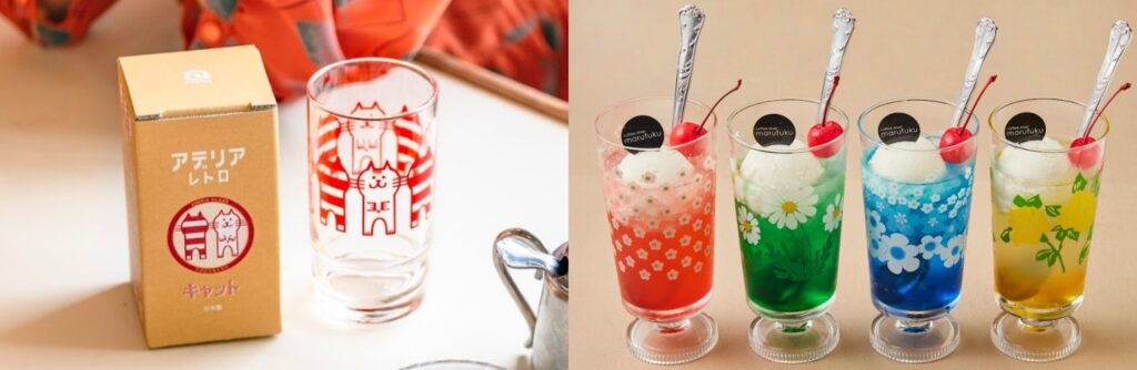 「ときめきレトロ巡り」開催を記念してグラスの復刻総選挙で見事1位になった「アデリアレトロ」の“キャット”柄のグラスを阪急うめだ本店先行販売! 1970年に発売された“キャット”は、仲良くおヒゲで繋がっている猫たちの姿がとってもキュート。また、会場に隣接する「丸福珈琲店」では、全4種類から選べるクリームソーダを「アデリアレトロ」のかわいいグラスで味わうことができるコラボカフェもお楽しみに。