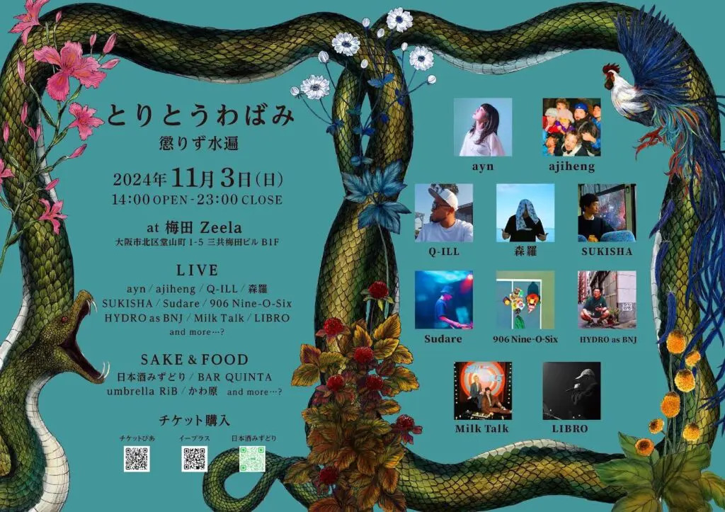 大阪の飲食店「日本酒みずどり」が梅田Zeelaにて『とりとうわばみ 懲りず水遍』を開催。出演はayn、ajiheng、Q-ILL、森羅、SUKISHA、Sudare、906 Nine-O-Six、HYDRO as BNJ、Milk Talk、LIBROの10組。出店は「日本酒みずどり」「umbrella RiB」「BAR QUINTA」「かわ原」の4店舗に加えて、「鮨 大吾」と「Cucinetta Porcospino」の2店舗が追加出店決定。出演者と出店舗ともに追加調整中。当日は日本酒みずどりセレクトの日本酒30種類以上が飲め、ミシュラン星付きの店などの料理が手頃な価格で味わえる。終盤には出演者たちのセッションも予定している。