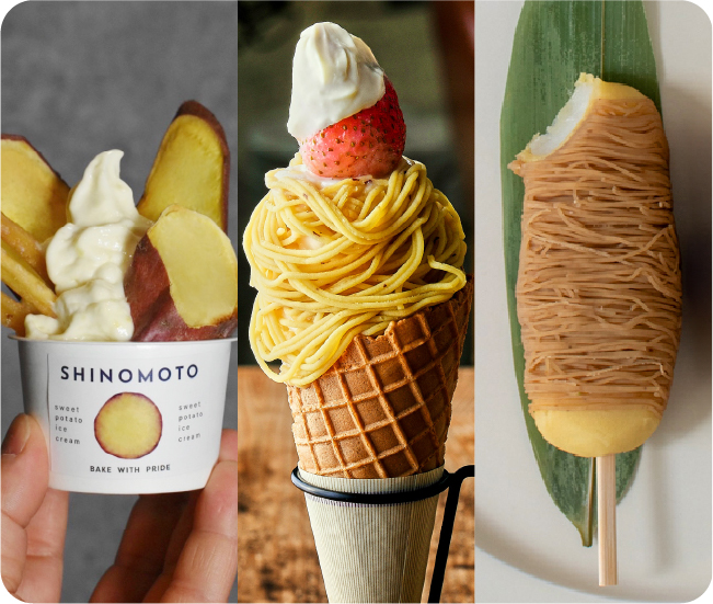 注文を聞いてからミルクアイスと焼き芋をドリルで混ぜながら作る「神戸芋屋 志のもと」(兵庫・神戸)の“芋づくし蜜芋ソフトクリーム”や、「やきいも処 DOCO弐番館」(山形・鶴岡)の干し芋にバターと粗塩を包み込んだ“干し芋 塩バタークレープ”、「京都金ノ華嵯峨嵐山店」(京都)のモンブランの進化系“モンブラン芋団子”、「Caféはにぽて」(福岡・大牟田)の二段熟成の焼き芋を春巻きの皮で包みパリッと揚げた“熟成焼きいものびーるチーズとあんバタースティック”などなど…アイスと、餡と、バターと……様々な素材とのマリアージュから生まれた焼き芋スイーツがもりだくさん!