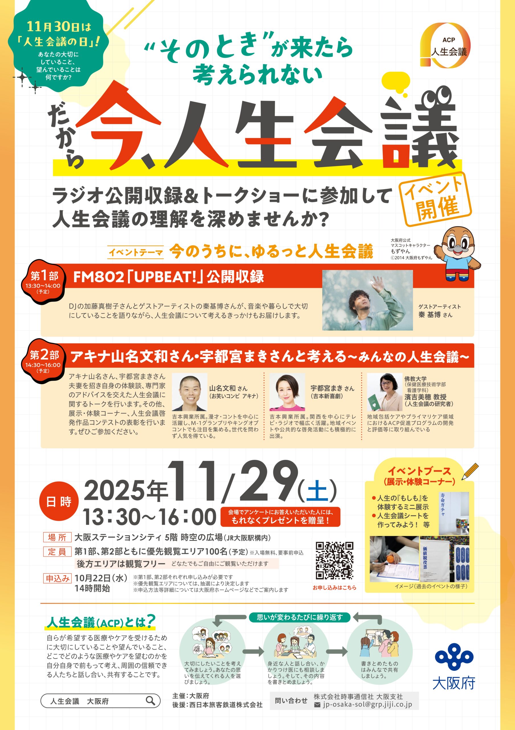 11月30日は、国が定めた「人生会議の日」(アドバンス・ケア・プランニングの日)。大阪府では、人生会議(ACP)の認知度を高めるため、府民の皆さんと一緒に考えるイベントを開催。