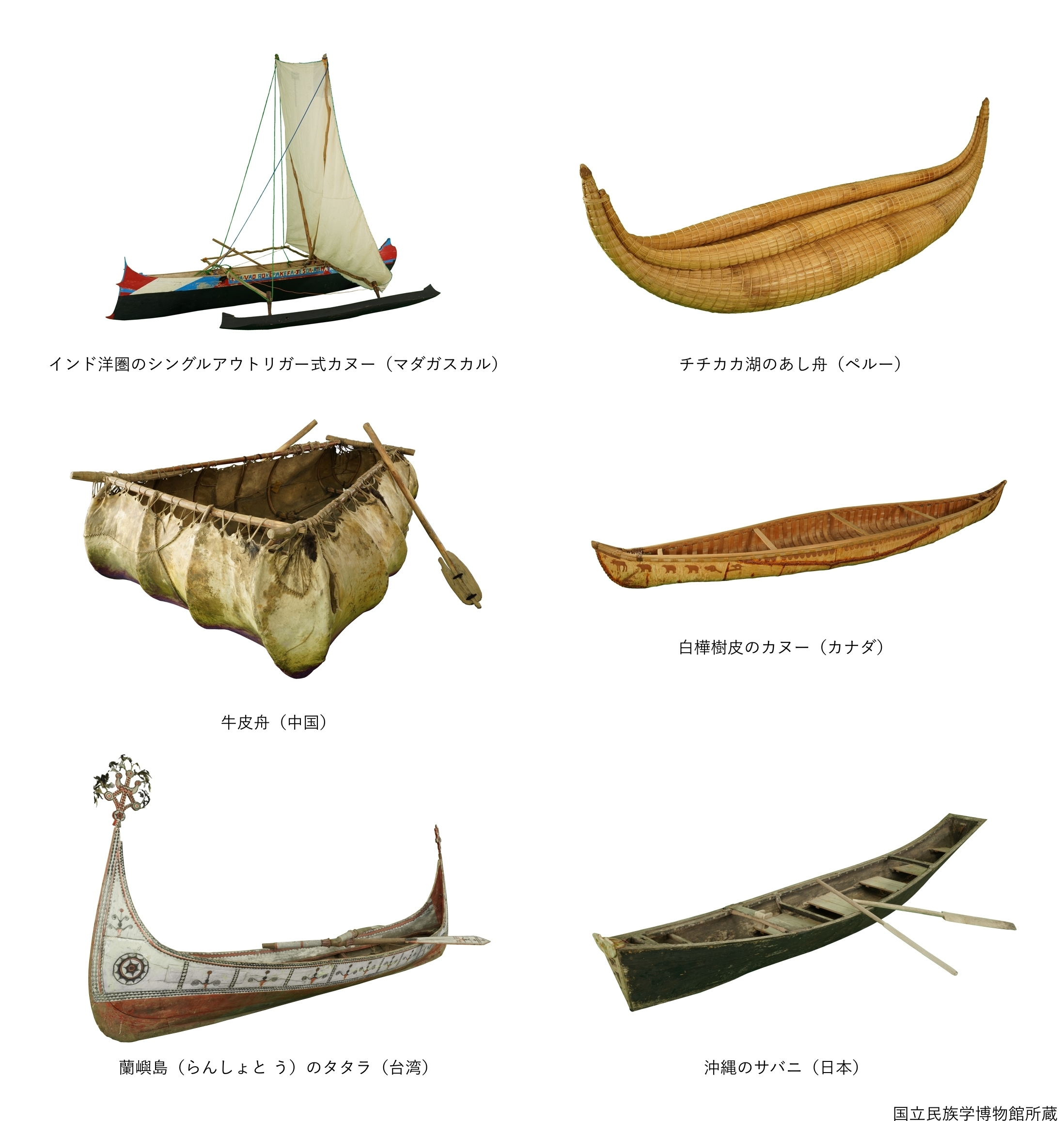 本展では人類史的な視点から、本館が所蔵してきたアジアやオセアニアの海域世界における多様な舟を紹介。また、舟をつくる道具やこぐ道具、漁撈(ぎょろう)で舟とともに使われる道具、舟による海上交易で運ばれるタカラたち、そしてあの世とこの世を行き来する精神世界における舟の役割など、暮らしの中での舟にも注目。
