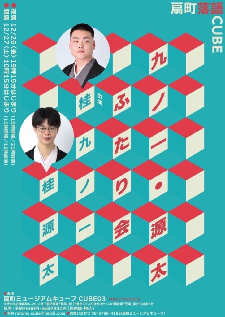 | 扇町落語CUBE 扇町落語CUBE 12月 26 – 12月 27 終日 ![]() 扇町ミュージアムキューブと、若手実力派の上方落語家・桂九ノ一氏が共催で贈る落語会「扇町落語CUBE」がスタート。 舞台は“映画館”。普段はミニシアター「扇町キネマ」として映画上映を行っている劇場空間「CUBE3」で、若手落語家の登竜門「上方落語若手噺家グランプリ」に2年連続で決勝進出した若手注目株・桂九ノ一氏が、寄席に留まらず、音楽フェスや立ち飲み屋など“普通じゃない”場所にも果敢に挑戦してきたその発信力を“映画館”でも存分に発揮する。落語会の前後には通常通り映画の上映も予定しており、「落語→映画」のハシゴが楽しめるのも、『扇町落語CUBE』ならでは。第1回目となる今回は、桂九ノ一氏と、同世代の桂源太氏によるふたり会を開催。 開催期間: 2025/12/26(金)・27(土) 開催時間: 26(金)夜席 開場19:00/開演19:15/終演21:00(約1時間45分) 27(土)朝席 開場10:00/開演10:15/終演12:00(約1時間45分) 開催場所: 扇町ミュージアムキューブ CUBE03(大阪市北区南扇町6-26) 料 金: 予約 2,500円、当日 2,800円 チケット予約・申込みはメール(info@omcube.jp)で ※当日清算 問合せ先: 06-6766-4166(扇町ミュージアムキューブ10:00~19:00)/info@omcube.jp WEBサイト: https://omcube.jp/event/9074/ | ||||||