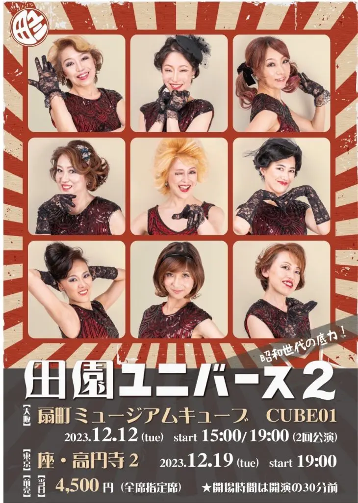 昭和生まれの出演者が歌って踊って芝居する、ハートフルコメディー昭和歌謡音楽劇! ㈱Artshand(アーツハンド)の代表で、自身もダンサー・講師を務める西郷輝美(さいごうえみ)と、ダンサー・役者など10人で繰り広げる昭和歌謡音楽劇「田園ユニバース」。2021年、コロナ禍で奇しくも無観客開催となった大阪開催の舞台「田園ユニバース」の続編を、大阪・東京で開催。劇場を後にするあなたの心がちょっとスキップしちゃう、クスっと笑えてホロリとする、そんなハートフルコメディーを、昭和歌謡メドレーとともにお届けする。