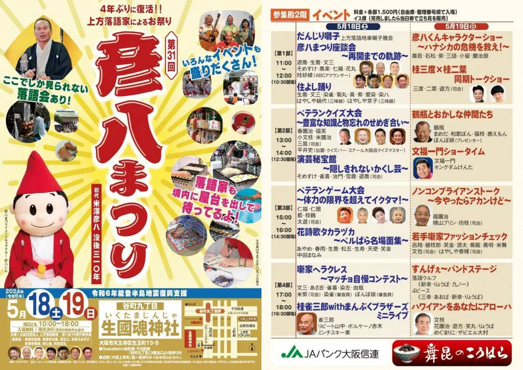 上方落語家が一堂に会す、年に一度の落語家の文化祭&ファン感謝デー『彦八まつり』が4年ぶりに復活! 例年9月開催だった彦八まつり、今回は5月の18日(土)・19日(日)に開催される。18日11:00~「彦八まつり座談会~再開までの軌跡~」で幕開け、落語家による踊りや音楽ライブ、クイズ大会、ゲーム大会など、多彩なイベントに、境内では落語家による屋台の出店もあって大賑わい!