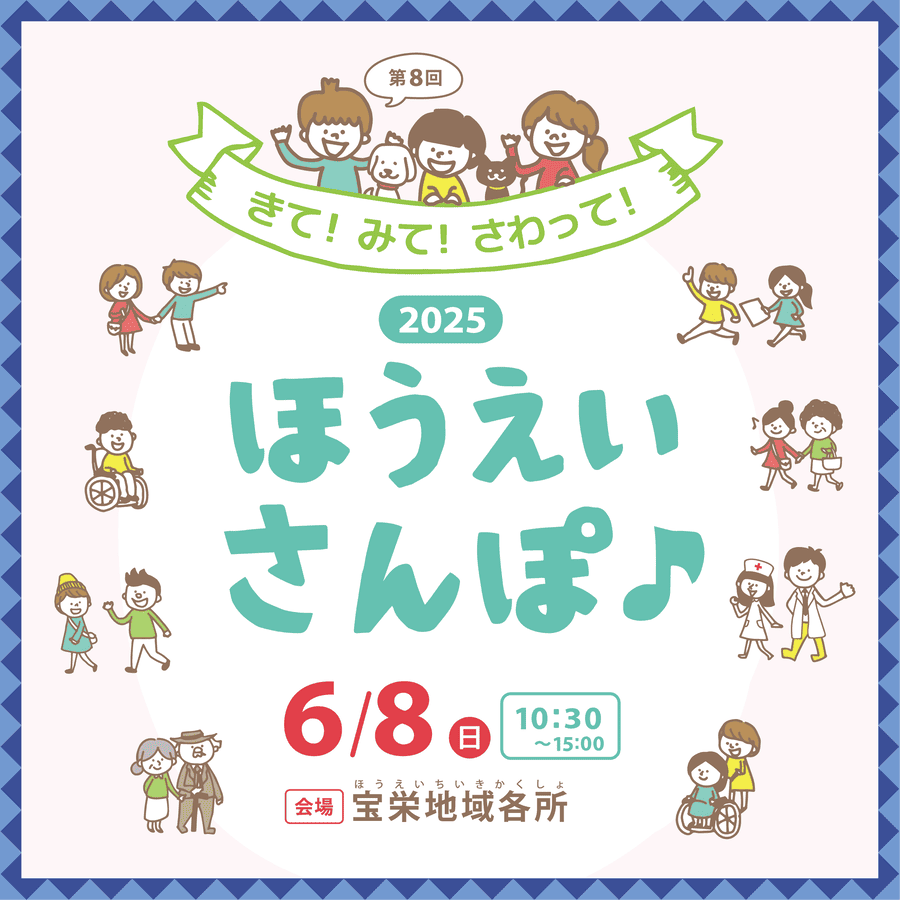 宝栄小学校を起点に、地域の福祉施設や企業などをめぐるウォークラリー形式のイベントで、足湯や工作、飲食など、子どもから大人まで楽しめる体験ブースが多数登場。参加無料・申込不要で、誰でも気軽に参加可能!