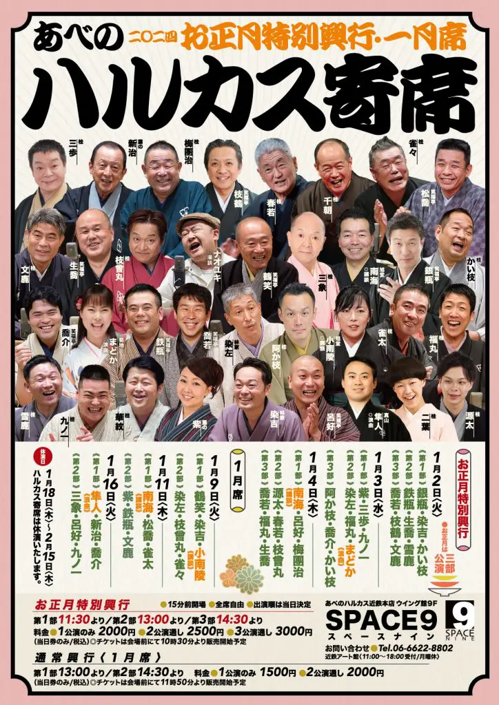 あべのハルカスにて週2回、毎日6人の出演者によって開催される「あべのハルカス寄席」。チケットは当日券のみ。“喜楽に落語”のコンセプトのもと、ふらりと気軽に立ち寄って、生のお囃子の入った本格的な寄席芸を楽しむことができる。1月2~4日は「お正月特別興行」として一日三回開催!