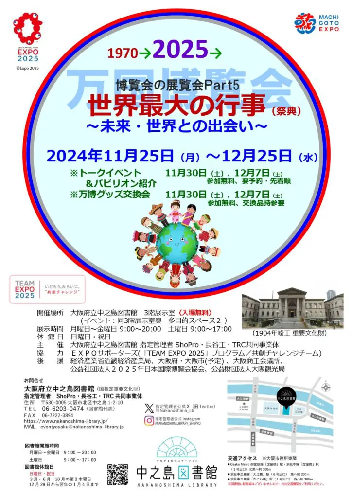 2025年開催の大阪・関西万博の概要紹介と共に、日本にとっても最大の行事であった1970年万博そして今後の博覧会を紹介。1970年万博のグッズ展示や、パビリオン紹介展示のほか、12/7(土)にはトークイベント&パビリオン紹介、万博グッズ交換会も開催(要事前予約)。