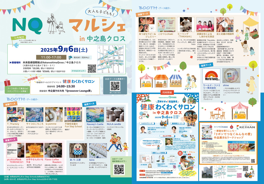 中之島で、親子で楽しめるマルシェを開催。コーヒーや焼き芋、芋けんぴなどのおいしい飲食ブース、輪投げやものづくりが楽しめるお子さま向け体験コーナー、心ときめくハンドメイド雑貨の販売など、22のブースが並ぶ。さらに、建物内のQrossover Lounge夢(14:00〜15:30)では、体のことを楽しく学べる「健康わくわくサロン」も同時開催!