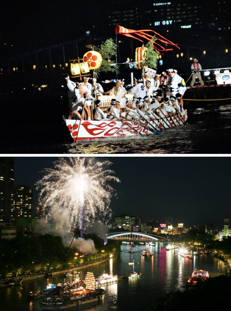 日本三大祭りの一つに数えられ、大阪の夏を彩る大祭・天神祭。宵宮祭は7月24日、厳かな神事である鉾流神事(旧若松浜 天満警察署前)をはじめ、鳳神輿・玉神輿・獅子舞氏地巡行が行われる。本宮祭の25日は、約2500人の行列からなる「陸渡御」、続いて、約100隻の船が大川を渡御する迫力の「船渡御」が大きな見どころ。祭りを締めくくるのは、夜空に大輪を咲かせる、約3000発の奉納花火(19:30~20:50 / 川崎公園大川一帯・桜宮公園一帯)。天神様にちなんだ、梅鉢の形に開くオリジナルの花火「紅梅」は必見。