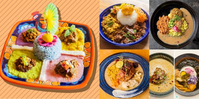 セミドライチキンカレーを乗せたスープカレータコス/イカ墨仕立てのポークビンダルーとはらいそ野菜カレーと大葉ジャークチキン