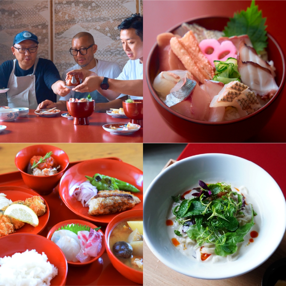 復興の旗手として立ち続ける創作料理・居酒屋「mebuki-芽吹-」からは、自ら育てたジャージー牛を使ったハンバーグや、輪島×大阪のコラボ海鮮丼が登場。「そ/s/KAWAHIGASHI」中東篤志さんによる限定メニューは輪島の復興を応援する気持ちを込めた「輪島ふぐステーキ御膳」(1人前4,400円/各日限定数50)。「輪島キリモト」が取り組む“輪島塗 レスキュー&リボーン”の和食膳が使用されている。さらに、「mebuki-芽吹-」と「そ/s/KAWAHIGASHI」がコラボした“輪島イートインブース”を設置!コラボメニューは、輪島と京都の素材を使った“まぜそば”。真造さんと山口さんの“にっぽん食むすび”スタンドで、輪島の日本酒やワインと、輪島の素材を使ったおつまみのペアリングも楽しんで。