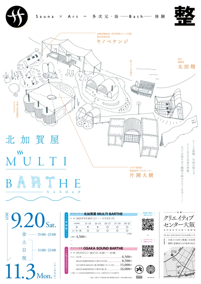 かつて多くの船が建造された木津川を臨むスペースに1.5か月間屋外サウナが出現! 建築家・太田翔(OSTR)が全体設計を担当。また、現代美術作家・ヤノベケンジは新作《SHIP’S CATSAUNA》を発表し、来場者は作品の中で、宇宙空間を漂うような内気浴を体験できる。そのほか、北加賀屋を拠点に活動するアーティスト・髙野千聖による作品展示、地元の通関会社と協働した梱包材を使った水風呂や更衣室など、北加賀屋ならではの歴史と創造性が交差する特別な場をつくり上げる。本イベントの幕開けを祝う音楽フェス「OSAKA SOUND BARTHE」(9月27日~28日/11:00~21:00/自由席6,500円~)も2日間開催。