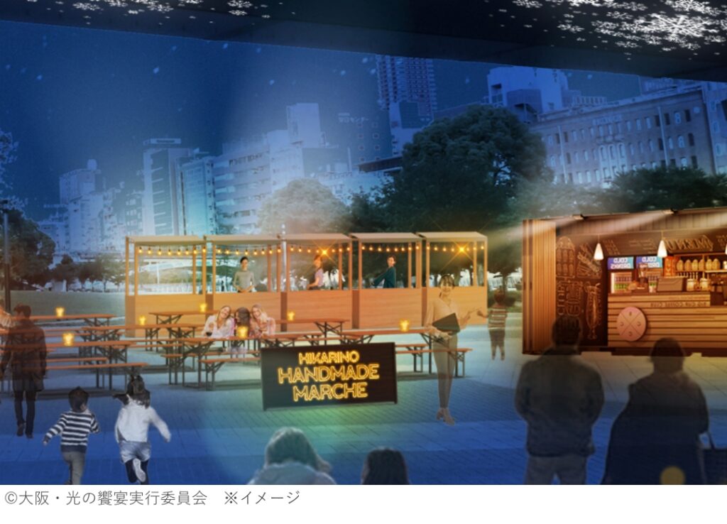 国指定重要文化財・大阪市中央公会堂のプロジェクションマッピングを眺めながら、こだわりの味を堪能できる「光のマルシェ」(16:00~22:00)や、クリスマスのプレゼントやお土産に出会える「クリスマスハンドメイドマルシェ」(17:00~22:00)もお楽しみに。