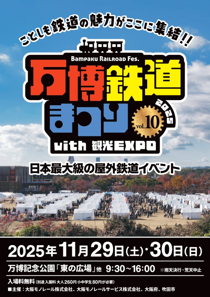 国内最大級、10万人規模の屋外鉄道イベントが万博記念公園で開催される。北海道から沖縄まで全国の鉄道会社等85社・自治体等16団体・企業等13団体が出展!「鉄道がつなぐ観光の未来~日本の旅は鉄道の旅~」というテーマのもと5つのゾーン(2025年大阪・関西万博/鉄道/観光/グルメ/ステージ)で様々な企画・展示を行う。鉄道ゾーンでは、各社の子ども制服を着用し記念撮影できる体験コーナー、グッズや車両部品の販売、ジオラマ走行など鉄道ファンにはたまらないイベントが登場。また、日本各地のご当地グルメや物産展を楽しめるほか、ステージイベント、万博にまつわる展示も行われ、家族みんなで楽しめる企画が目白押し。
