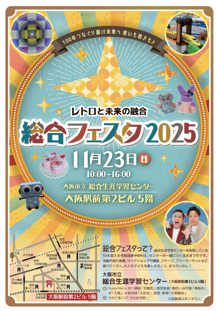 大阪市立総合生涯学習センターを利用している市民団体やNPOとセンターが一緒に作るお祭り「総合フェスタ2025」。今年は50団体が参加し、ものづくりや体験教室、作品展示、ステージ発表、手作り小物の販売、など、いろいろな学びが大集合! そのほか、サイエンスショーやみんなであそぼうプラレール、お絵描き水族館、ボードゲームなど大人も子どももみんな一緒に楽しもう!