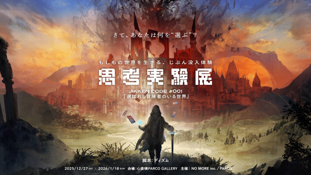 | 「思考実験展 JIKKEN CODE#001 ―選ばれし冒険者のいる世界―」 「思考実験展 JIKKEN CODE#001 ―選ばれし冒険者のいる世界―」 12月 27 2025 – 1月 18 2026 終日 ![]() 今春、東京にて開催され、「リアル性格診断」として大きな話題を呼び、追加チケットも即完売、約1万2千人を動員した体験型イベント『思考実験展』が、大阪の心斎橋PARCOで開催決定! 「もしも別の世界に⾏けたなら、あなたはどう⽣きるのか︖」その思考を実験していく、新たな”じぶん没⼊体験”エンターテインメント。 来場者は物語の主人公として世界に入り、TRPGの名作『カタシロ』の作者・ディズム氏が手がけたシナリオをもとに、数々の“答えのない問い”と向き合いながら選択を重ねることで、あなたの⼤切なものがむきだしになってゆく――そんな知らないじぶんに出会うための体験を創り上げる。 脚本:ディズム(驚天動地倶楽部) プロデュース:NO MORE 開催期間: 2025/12/27(土)~2026/1/18(日) ※12/31(土)は18:00まで営業、1/1(木・祝)は全日休止 開催時間: 10:00~20:00 ※体験時間は約60分 ※参加人数は1~5名で参加可能 開催場所: 心斎橋PARCO 14F PARCO GALLERY(大阪市中央区心斎橋筋1-8-3 心斎橋PARCO14F) 料 金: 4,500円/ 人 問合せ先: https://support.shikoujikkenten.com/ WEBサイト: https://shikoujikkenten.com/ | ||||||