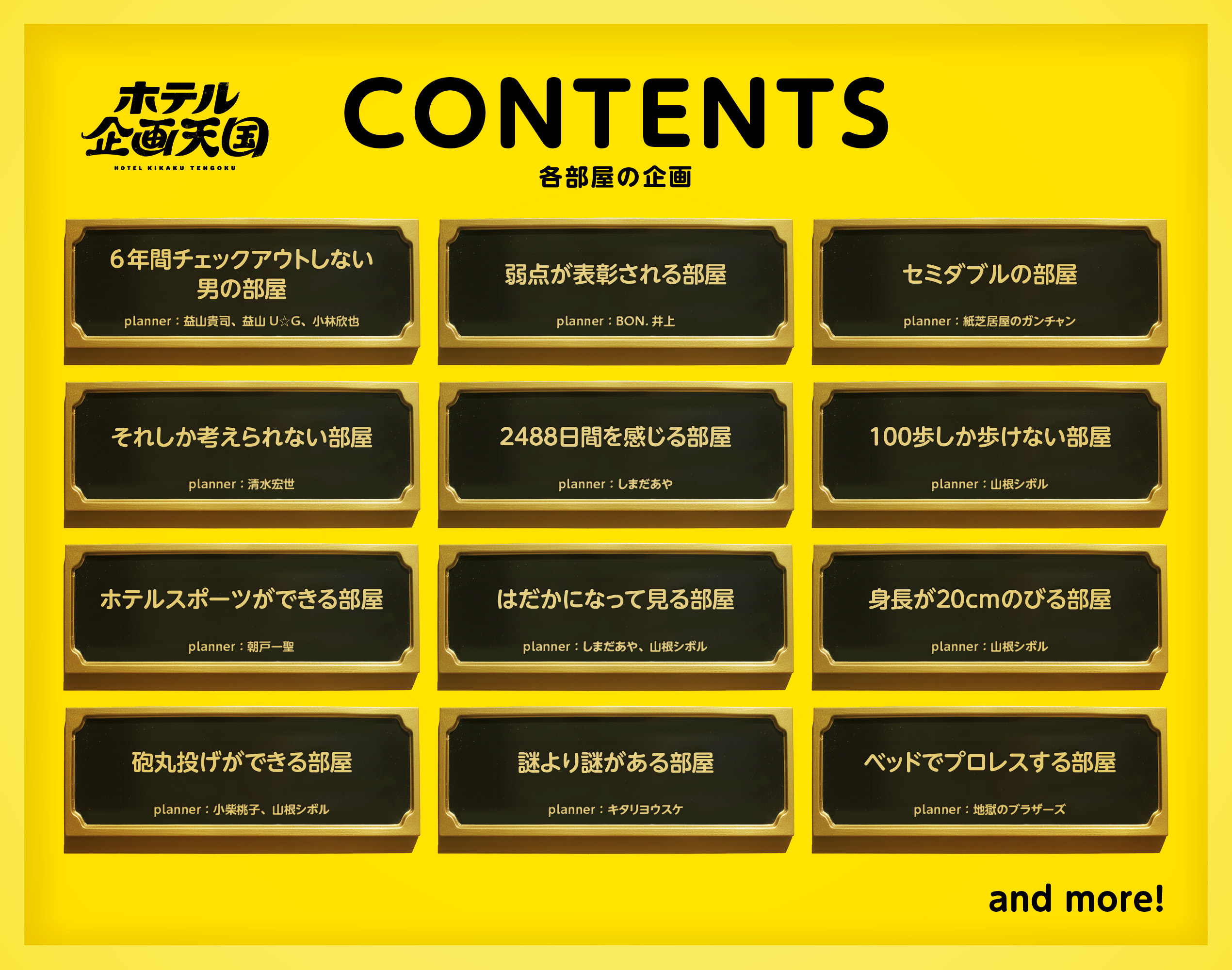 紙芝居屋、エッセイスト、ゲームデザイナー、劇作家、ダンサー、謎解きクリエイターなど、ジャンルを問わず関西中のクリエイターたちが一斉にチェックインし、プランナーとして自由に考えた企画が、全客室・全館にわたって展開される。品質よりアイデア重視、というかむきだし。そんな“実験的すぎる謎企画”が全部屋に宿り、この機を逃せば二度とできないような体験が好奇心に負けたお客様をおもてなし。