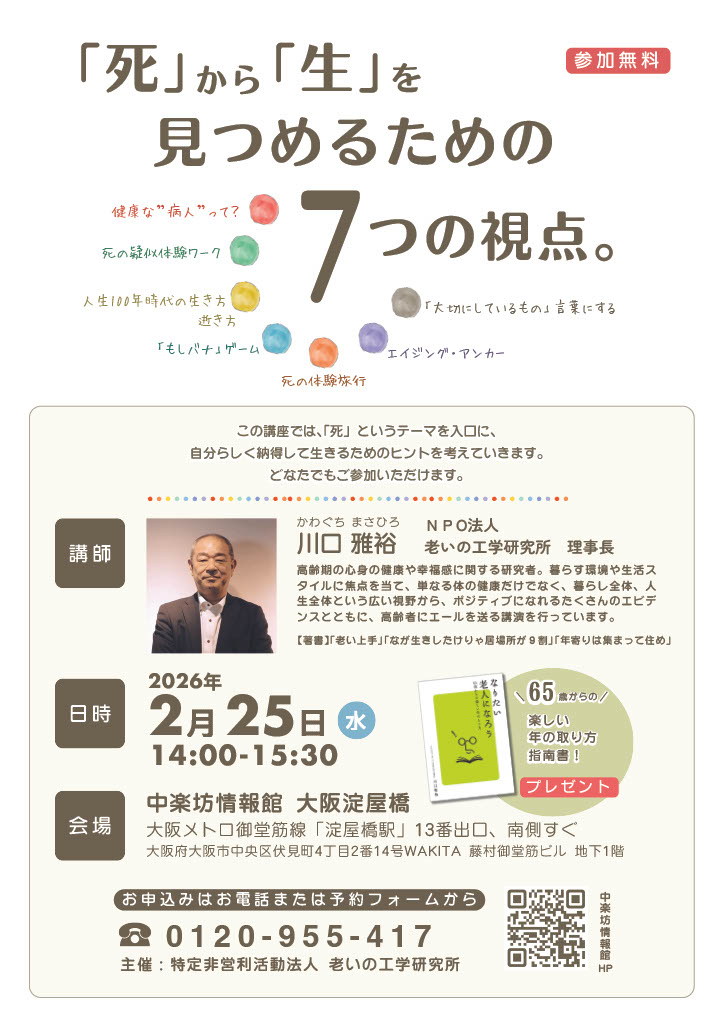 この講座では、「死」というテーマを入口に、自分らしく納得して生きるためのヒントを考えていく。どなたでもご参加できます。講師を務めるのは、『なが生きしたけりゃ居場所が9割』『年寄りは集まって住め~幸福長寿の新・方程式~』などの著著をもつ、NPO法人「老いの工学研究所」理事長・川口雅裕さん。